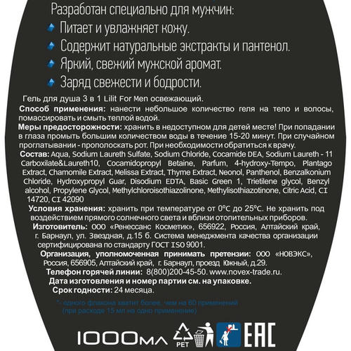 Способ применения: Небольшое количество геля нанесите на влажное тело или губку, помассируйте до образования пены, затем смойте водой