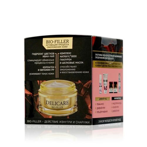 Серия BIO-FILLER – революция в уходе за лицом. Уникальное сочетание комплекса гиалуронового филлера, гидролатов, натуральных экстрактов и шелковых масел запускает процесс омоложения кожи и адаптируется под потребности каждого возраста. Ежедневное применение способствует уменьшению возрастных проявлений, разглаживает кожу и уменьшает проявление морщинок.