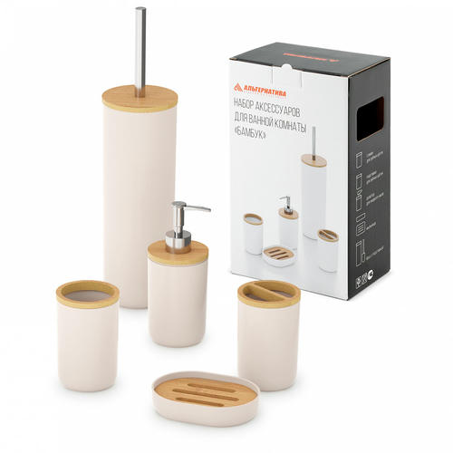 Набор аксессуаров для ванной комнаты “Бамбук” 16х10,5х26,5см 5 предметов: подставка для зубных щеток, стакан для зубных щеток, мыльница, дозатор для жидкого мыла, ерш с подставкой