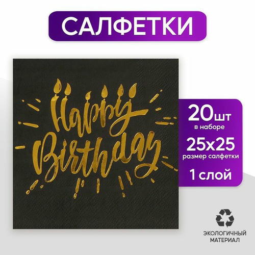 Салфетки бумажные Happy birthday, 25х25см, 20 шт., золотое тиснение, на чёрном фоне