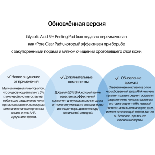 • Мы учли мнения клиентов о том, что существующий пилинг с 5% гликолевой кислоты оставляет небольшое раздражение кожи при использовании, поэтому мы заменили ее гипоаллергенным компонентом АНА и улучшили эффект.