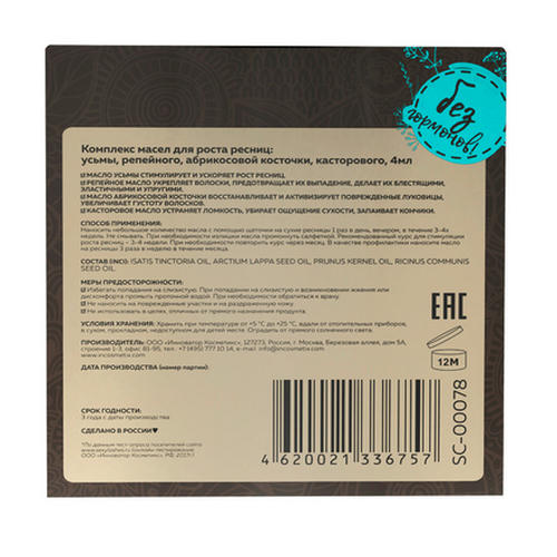 Способ применения: Применение заключается в нанесении небольшого количества масла на сухие ресницы дважды в день утром и вечером в течение 20 дней, не смывать, сопровождая процедуру небольшим массажем. Эта процедура дает прекрасный результат удлинения, укрепления луковиц, уплотнения стержня волоска. Перед использованием следует нанести пару капель на небольшой участок кожи и проверить реакцию.